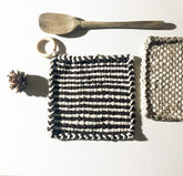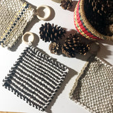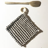 Elevate the style of your table or stove top with this practical kitchen essential. These potholders are individually woven in Brooklyn, adding a touch of handmade charm to your space. Made with durable cotton and updated with a fresh palette, each one also features a wood hanging loop. After being washed, these 8" square potholders shrink to 7" and can be easily cleaned by machine wash cold, drying flat or tumble drying.