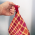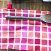 Classic woven plaid dish towel in yarn dyed cotton. Shades of raspberry red, orange, deep pink and moon yellow with a hanging loop on the back side.
