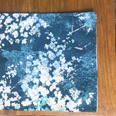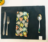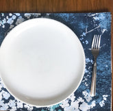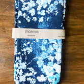 Featuring a navy blue background and delicate white fluffs, this placemat has a unique print reminiscent of a Monet painting. Each one is different. The back side, a dark grey, is also water resistant, making it both stylish and functional.