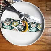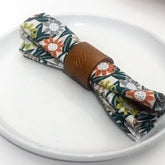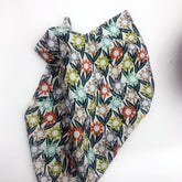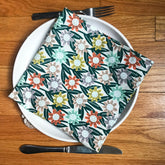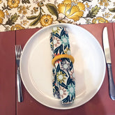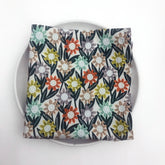Daisies in muted hues of sun, aqua blue, mushroom and burnt orange. Beautiful and light weight cotton. After drying, fold while warm to prevent any wrinkles. A great everyday napkin.
