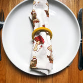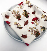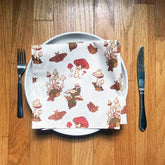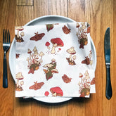Go foraging with these whimsical mushroom napkins. Beautiful light weight organic cotton.  After drying, fold while warm to prevent any wrinkles.