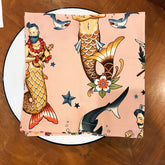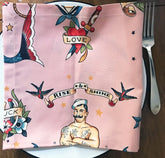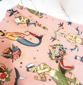 Beefy Mermen swimming and other tattoo art in this quirky print. Born to fight, true love, rise and shine and good luck are some of the messages.