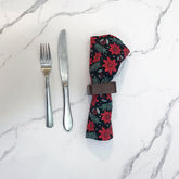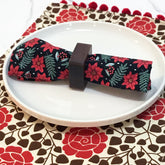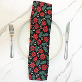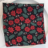 A classic print refreshed with a black background. Poinsettia, branches and winter berries on solid black cotton. A lovely, wintery feel that can be used throughout the New Year's.