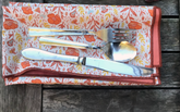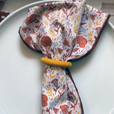 A beautiful way to contribute to less waste. These terracotta colored 100% organic cotton poplin napkin opens to a generous 21" square large size. The high thread count makes it feel extremely soft. This reversible napkin has a pretty poppy print with scattered bees on one side while the other is a solid terracotta color complementing the print . Looks beautiful rolled in a napkin ring or set square on your plate. Serged edges.