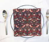 If you know Liberty of London you must know the infamous Strawberry Thief. A cheeky little bird stealing berries. This beautiful cotton print in shades of warm browns, copper, olive green, warm white and merlots. Reverses to a solid toast color. Choose which side to show off on your table.