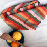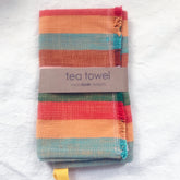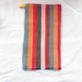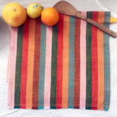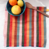 A lovely, absorbent cotton dishtowel in a bright colored circus stripe. Fringe edges. Hanging loop on the back side.