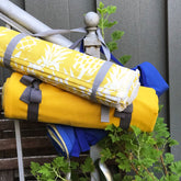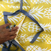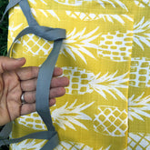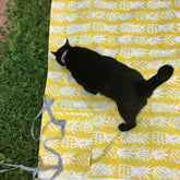 Picnic blanket with a summery pineapple print. Complete with carry strap and storage pocket. Water resistant, stain and soil resistant. Don't worry about spilling the rose on this blanket. Very popular at the Celebrate Brooklyn! Festival in Prospect Park. Perfect for the beach or after a rain at the park. Easy to carry, roll it up and tie it closed. A corner pocket will hold your flip flops, protect your phone from water or the sun.