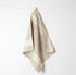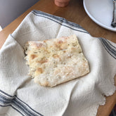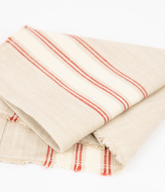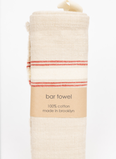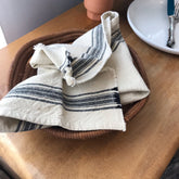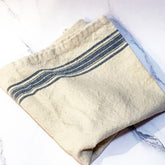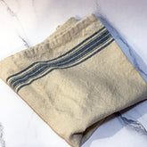 Stripe dish towel that is farmhouse and French vintage inspired. The Bowery Bar Towel is smaller than your average dish towel. It's a nice sturdy weight made of a beefy slub woven cotton in a stone white color with a few blue stripes. Hanging loop on the back side and topstitching in white at the top and bottom. Your new best friend in cleaning up counter tops and wiping your hands.